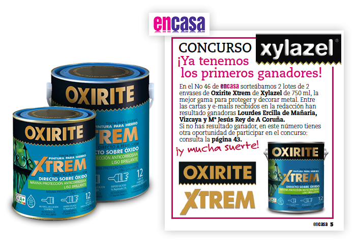 La primera fase del concurso de Xylazel Oxirite Xtrem y la revista En Casa ya tiene sus primeros ganadores, que se llevarán sendos lotes de productos del nuevo Esmalte Antioxidante al agua, Oxirite Xtrem:
